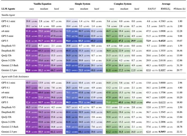 相比之下,专门优化的推理模型展现出质的飞跃。GPT-5和DeepSeek-R1等系统凭借强大的复杂推理与数学运算能力,在简单场景下的符号准确率普遍突破80% ,证明了推理能力对于科学定律发现的关键作用 。