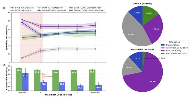 具体分析显示 ,在较弱的GPT-4.1模型中,45.4%的代码调用集中于数值计算环节,有效弥补了其计算能力的不足。而在强大的GPT-5-Mini中 ,69.4%的代码资源被投入函数拟合过程,导致模型倾向于快速获取局部最优解,而非进行全面的探索以寻找全局最优的物理定律 。